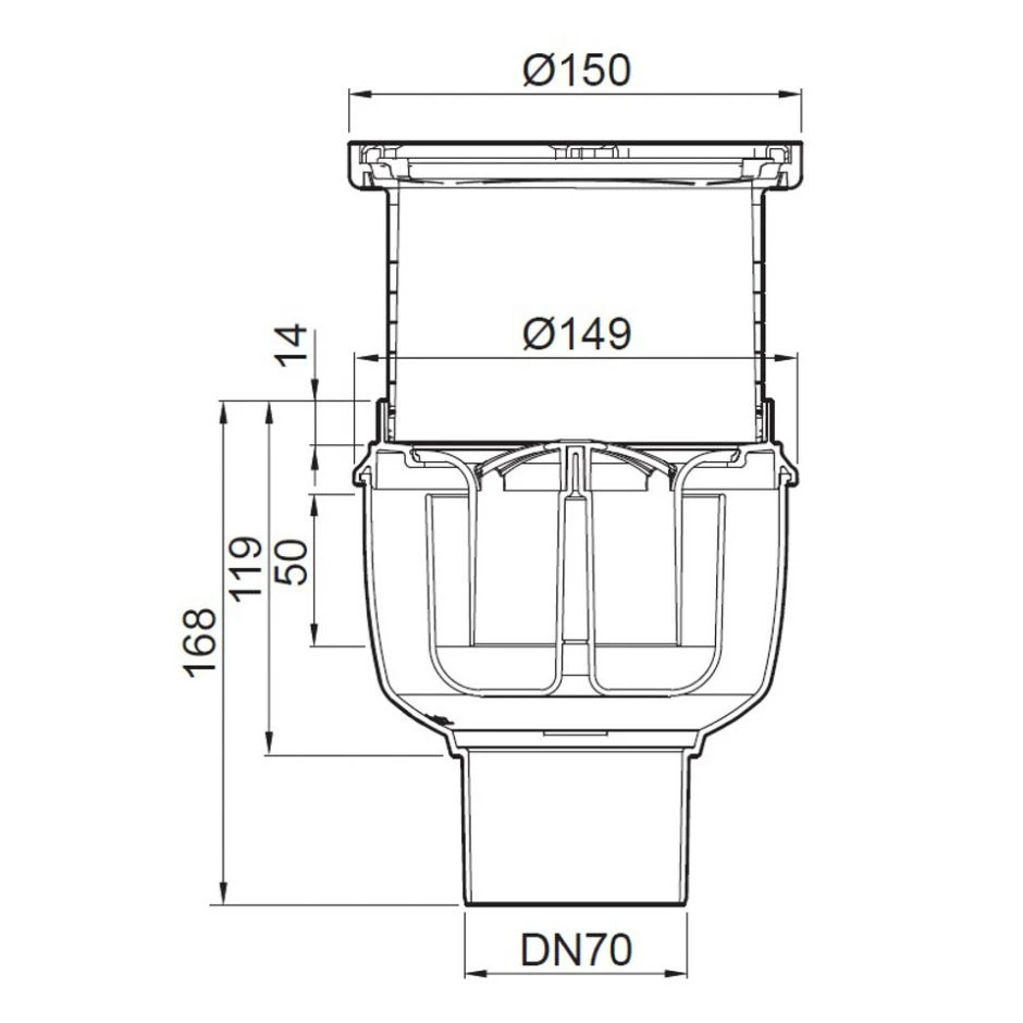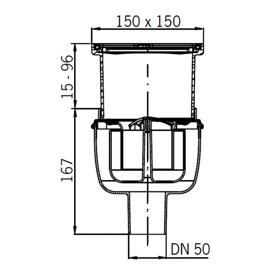 Das Maà des Kunststoffrahmens betrÀgt 150 x 150 mm und die Sperrwasserhöhe 50 mm. Die notwendige Bodenaussparung ist von der Ablaufart abhÀngig.