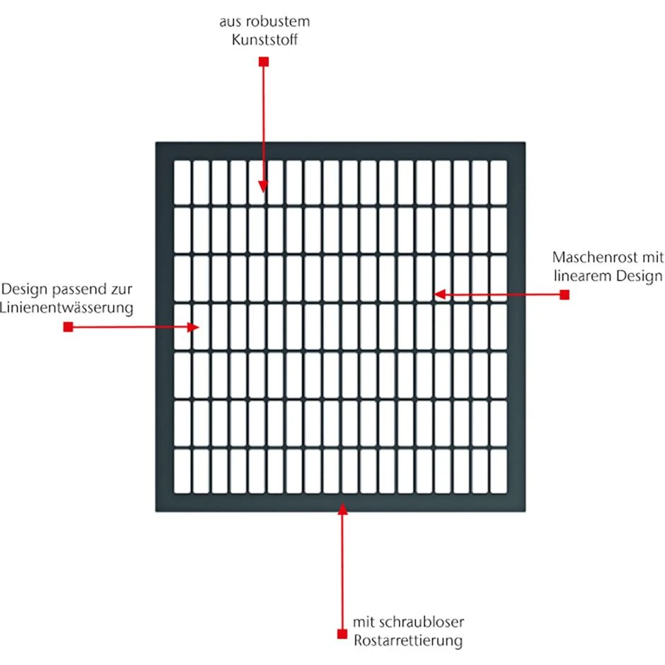 Der ACO Self Europoint Maschenrost aus Kunststoff dient zur Punktentwässerung von Hofeinfahrten, Garten- oder Parkflächen genutzt. Der Rost ist PKW-befahrbar und sehr witterungsbeständig, aufgrund des hochwertigen Kunststoffs. Eine einfache Reinigung spricht für sich, die eng stehenden Längsrillen lassen außerdem nur wenig Schmutzeinfall zu. Die rutschfeste Oberfläche bietet zusätzlich viel Sicherheit beim Begehen.