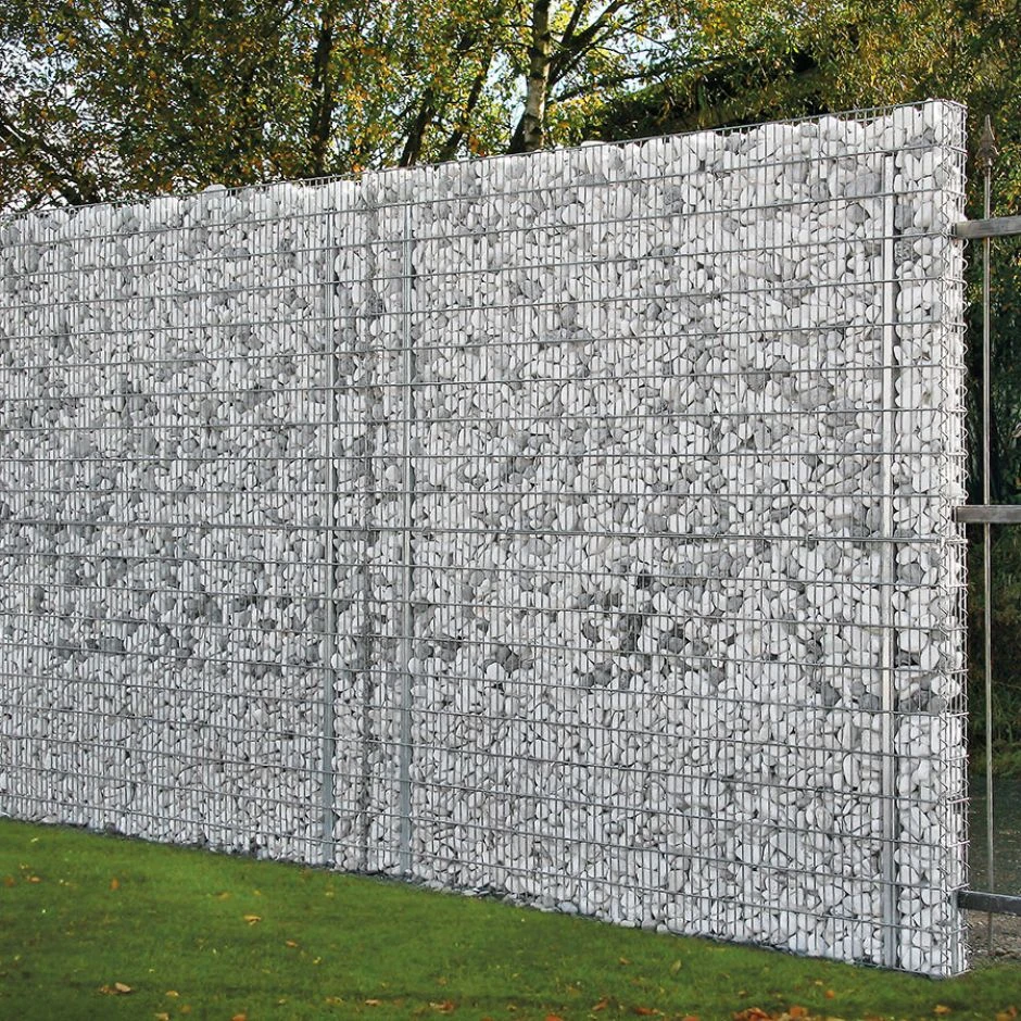 Für die Steinfüllung eignen sich Steine mit einer Körnung von mindestens 25 mm. Die Stabstärke der tauchbad-feuerverzinkten Drähte beträgt 5/3,5 mm. Die Lieferung des Gabionenzaun-Grundmoduls erfolgt als Bausatz ohne Steine.