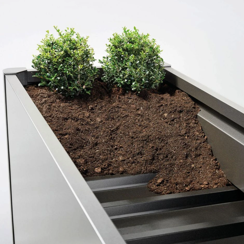 Das Biohort Pflanzbeet Belvedere ist ein hochwertiges Pflanzbeet das Ihrem Garten oder Ihrer Terrasse einen Hauch von Eleganz und Stil verleiht. Es ist aus feuerverzinktem, polyamid-einbrennlackiertem Stahlblech gefertigt, sehr stabil und überaus langlebig. Mit seinen abgerundeten Ecken und ohne sichtbare Verschraubungen fügt es sich nahtlos in jede Umgebung ein. Ein integrierter Zwischenboden reduziert das Erdvolumen und spart wertvolle Zeit. Der Zwischenboden wird beim Aufbau einfach auf die zweite Sicke von oben aufgelegt. Um Staunässe zu vermeiden gewährleistet ein integrierter Wasserablauf eine optimale Entwässerung.
