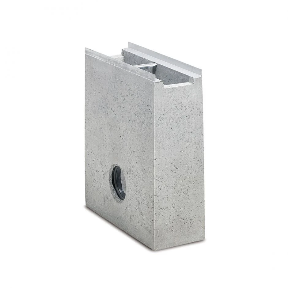 Er verfĂŒgt ĂŒber eine einbetonierte KG-Muffe fĂŒr einen DN 100 Rohranschluss.