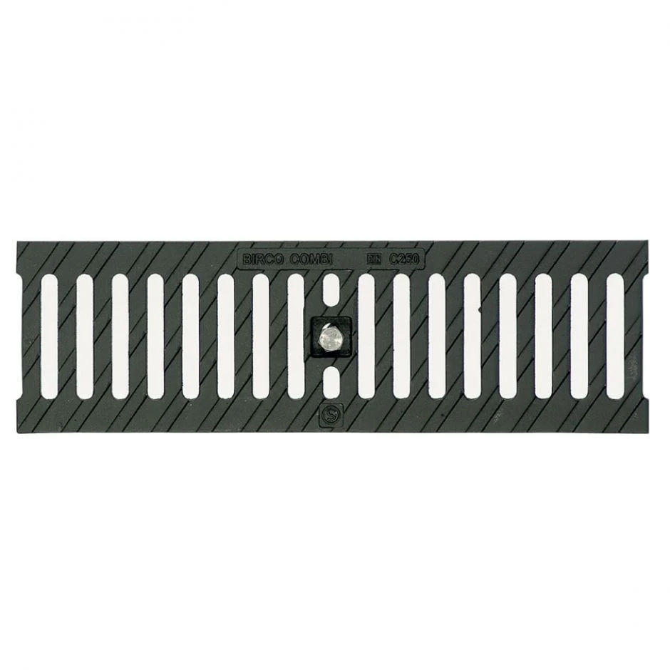 Die BIRCOlight Steg-Gussabdeckung fĂŒr EntwĂ€sserungsrinne NW100 ist 0,5 m lang und ist schwarz-tauchlackiert.