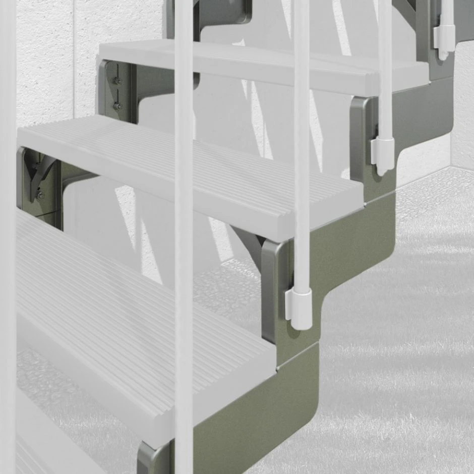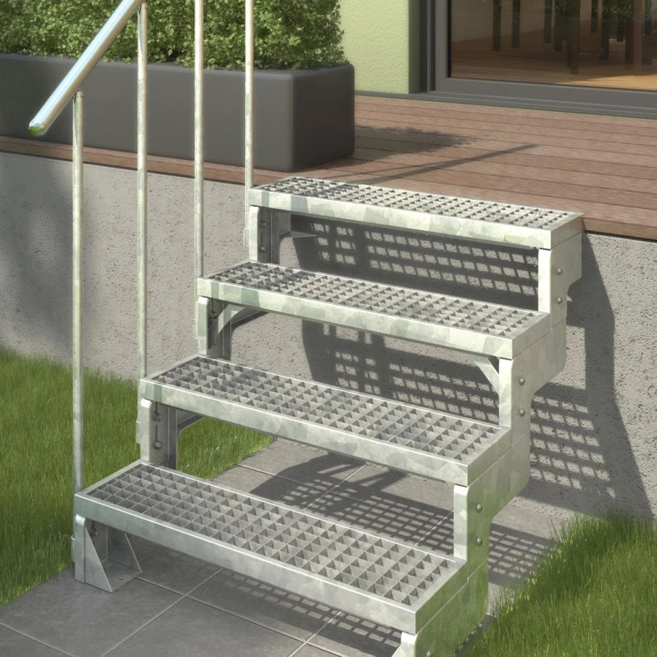 Das Baukastensystem ermöglicht eine individuell zusammenstellbare Außentreppe. Sie erhalten feuerverzinkte Stahlwangen, denen Sie über das Zubehör die gewünschten Stufen aus Kunststoff (GFK) oder in der Gitterrostvariante in zwei verschiedenen Größen hinzufügen können. Optional rundet das Steiggeländer die Treppenkonfiguration ab.