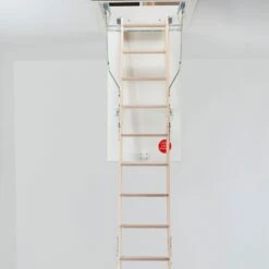 Das 3-teilige Leiternteil besteht aus Kiefer-Holmen und Buche-Stufen. Die clickFIX thermo erfĂĽllt alle Anforderungen an Bauvorschriften fĂĽr modernes und engergiebewusstes Bauen.