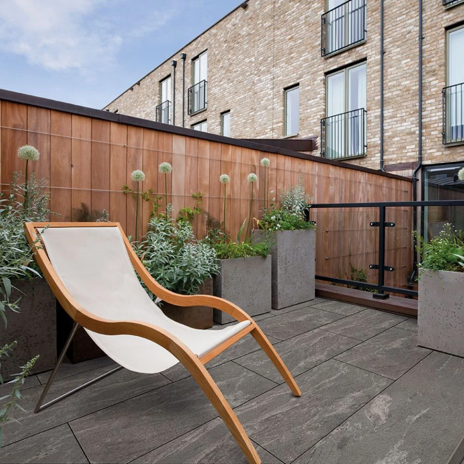Wer es dezent mag, wird die Terrassenplatte NEGRO SANTIAGO von EMPEROR lieben. Das Farbspiel aus grauen und weiĂen Nuancen sorgt fĂŒr eine elegante und beruhigende AtmosphĂ€re. Ideal fĂŒr eine entspannte und zeitlose Gestaltung von Balkon- und Terrassenlandschaften.