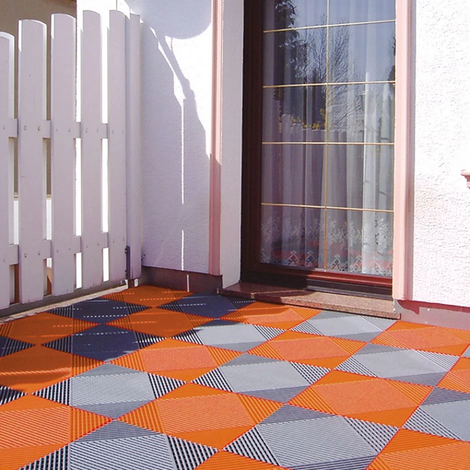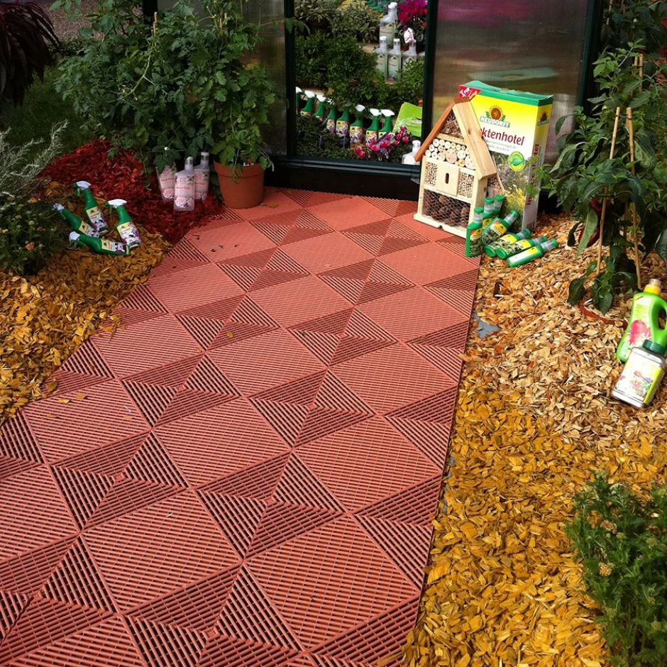Die terracotta-farbenen florco Bodenfliesen aus Kunststoff zeichnen sich durch ihre Leichtigkeit bei gleichzeitiger enormer Widerstandsfähigkeit aus und eignen sich daher besonders für Balkone und Flächen, die nur eine begrenzte Traglast haben. Dank des einfachen Klick-Verlegesystems können die großflächigen Platten schnell verlegt werden, auch auf losen Untergründen mit Kies oder Schotter. Unschöne größere Flächen werden in kürzester Zeit in einladende Areale verwandelt.