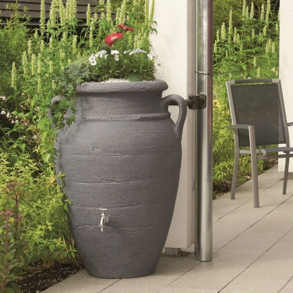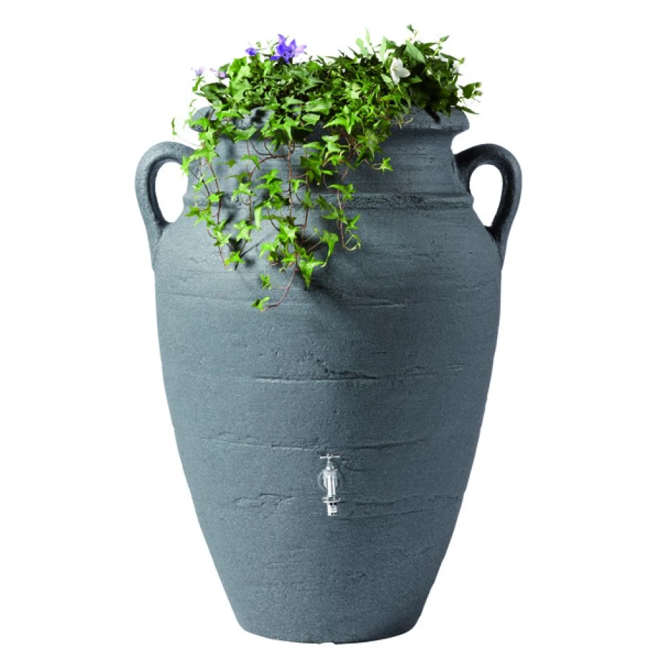 Dieser antik wirkende Regenwasserspeicher mit integrierter Pflanzschale ist ideal fĂŒr mediterrane GĂ€rten. Die Amphore kann einfach in jedem Garten aufgestellt werden und mit einem FĂŒllautomaten an ein Fallrohr angeschlossen werden. So kann Regenwasser gespeichert werden und spĂ€ter zum Beispiel zur GartenbewĂ€sserung benutzt werden. Die Amphore ist in den Farben terracotta, sandbeige und dark granite erhĂ€ltlich.