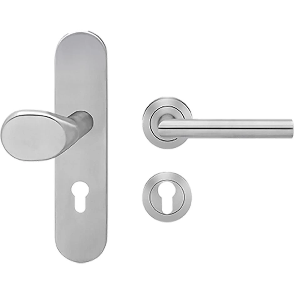 Die Karcher Schutzgarnitur ESG28 670 PZ ist für Türstärken von 39-43 mm geeignet. Die Schutzgarnitur mit außen Langschild und innen Rosetten ist aus Edelstahl gefertigt. Der gekröpfte Knopf EK582G ist auf einem Langschild mit 255 mm Länge und 53 mm Breite festmontiert. Die Innenrosetten haben einen Durchmesser von 52 mm. Die Schutzgarnitur wird inklusive Befestigungsschrauben und Schraubwechselstift geliefert.