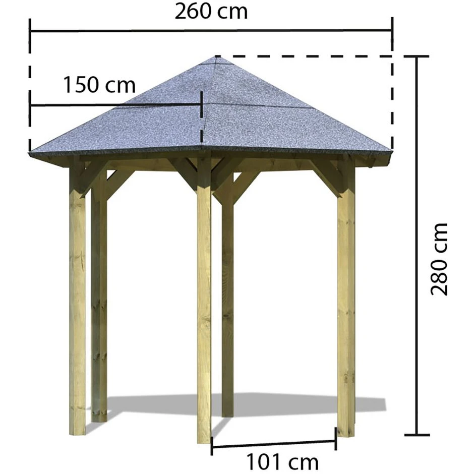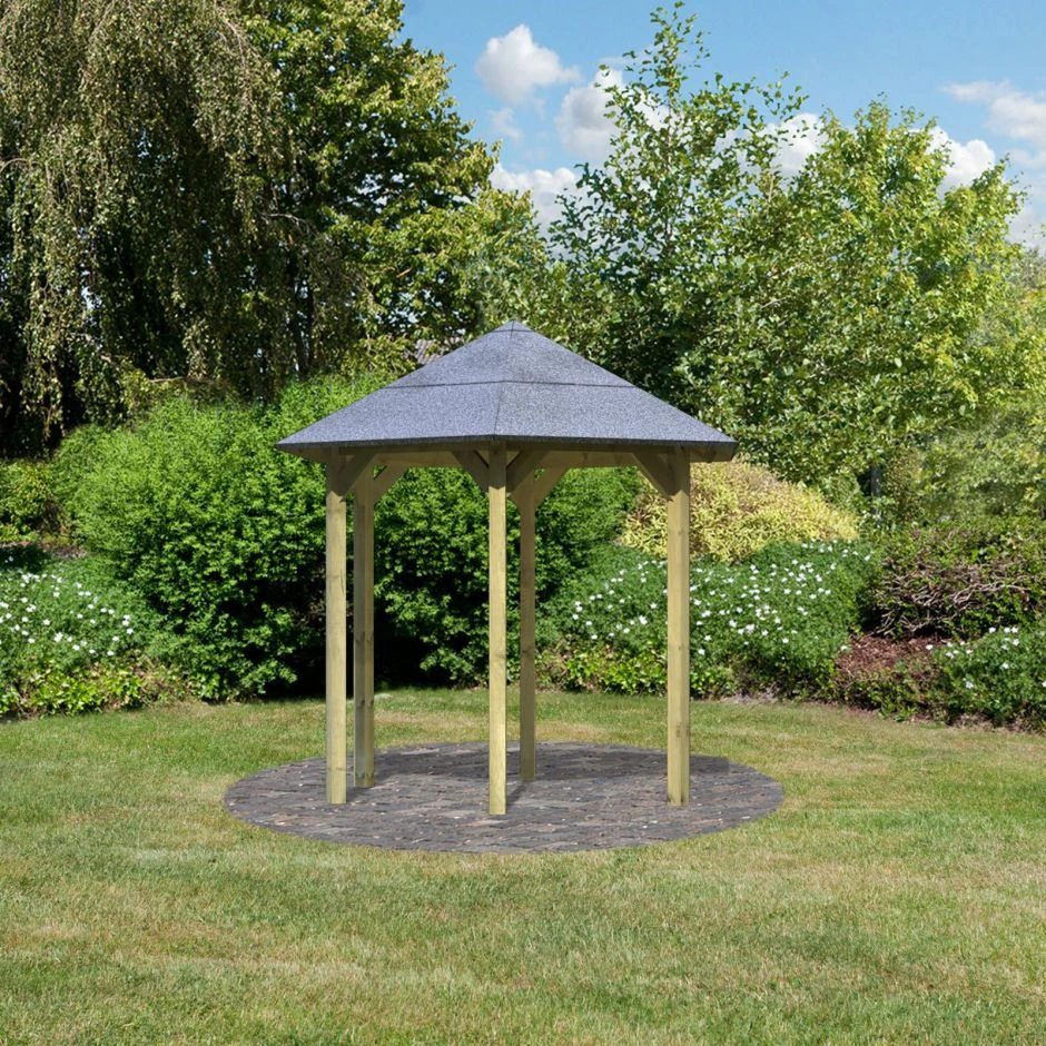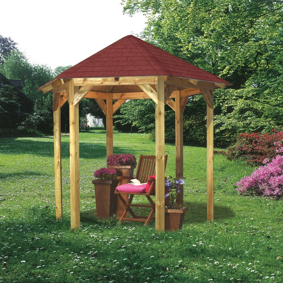 Der Karibu Pavillon Lissabon besteht aus kesseldruckimprägniertem Nadelholz, das eine lange Lebensdauer und zuverlässigen Schutz vor den Einflüssen von Wind und Wetter verspricht. Damit Sie das Dach direkt nach dem Aufbau vor Feuchtigkeit schützen können erhalten Sie mit dem Pavillon-Bausatz Dachpappe in ausreichender Menge. Für einen dauerhaften Schutz vor der Witterung eignen sich die Karibu Bitumen-Dachschindeln, die Sie über das Zubehör mitbestellen können. Um die Pfosten statikgerecht im Boden zu verankern benötigen Sie H-Pfostenanker zum Einbetonieren.
