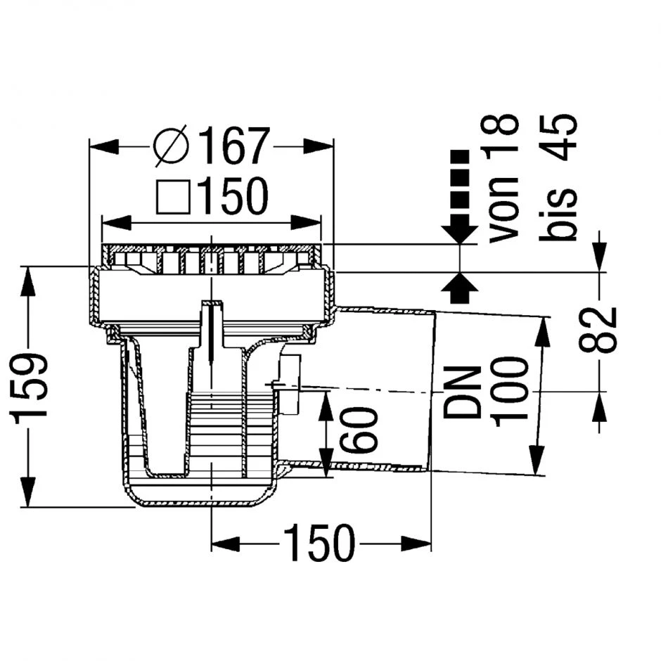 Der Kellerablauf von KESSEL 150×150 mm aus Kunststoff hat einen Geruchsverschluss 60 mm und herausnehmbarem Schlammeimer. Er hat eine Abflussleistung von 1,8 L/s.