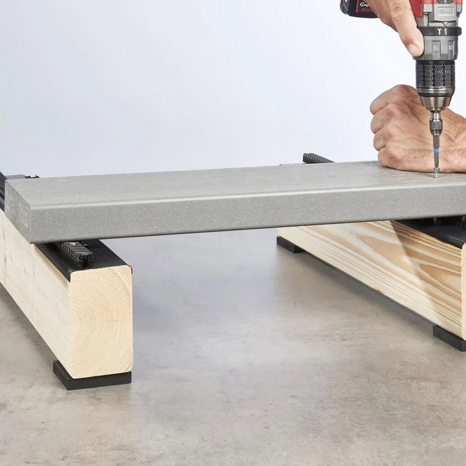 Das NATURinFORM Distanzstück ist für die Montage der Terrassendielen auf einer Holz-Unterkonstuktion. Da Holz Wasser auf nimmt und sich die Feuchtigkeit nicht auf die WPC Terrassendielen übertragen soll werden auf die Holz-Unterkostruktion die Distanzstückke aus PP geschraubt. Auf diese Weise kann sich die Feuchtigkeit vom Holz nicht auf die WPC Terrassendielen übertragen. Das Distanzstück ist 16x13x730 mm.