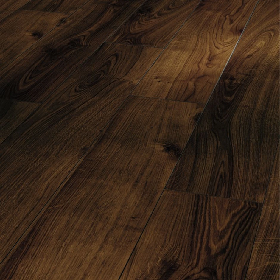 Das Design Eiche geräuchert gebürstet 4V ist ein Boden mit klassischer 1-Stab Landhausdielen Optik. Die Dielen haben V-Fasen entlang der Längs- als auch der Kopfkanten welche so jede Diele einzeln betonen und den Laminatboden wie einen echten Holzdielen-Boden erscheinen lassen. Die Dielen sind dunkelbraun und haben eine kräftige Maserung und Musterung.