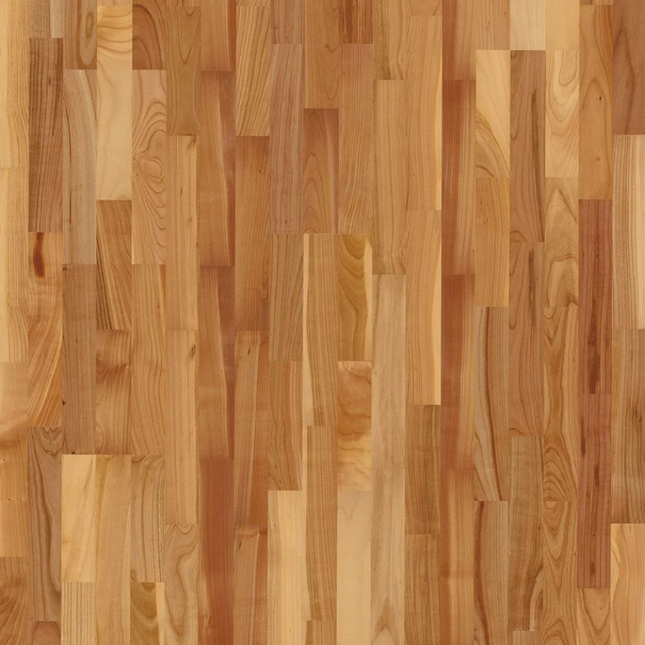 Die Deckschicht aus Kirschholz des Parador Parketts Classic-3030-Living Kirsche-europäisch-gedämpft matt bringt eine heimelige und urwüchsige Optik in jedes Zimmer. Warme Gelb- und Brauntöne ergänzen eine Vielzahl von Einrichtungsstilen und die Living-Sortierung des Kirschholzes vertieft den Eindruck von lebendiger Farb- und Formgebung.