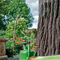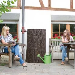 Der Regenwasserspeicher Evergreen dunkelbraun aus witterungsbeständigem PE-Kunststoff von Rewatec Arves hat ein Fassungsvolumen von 475 Liter und hat das Design einer deutschen Eiche.