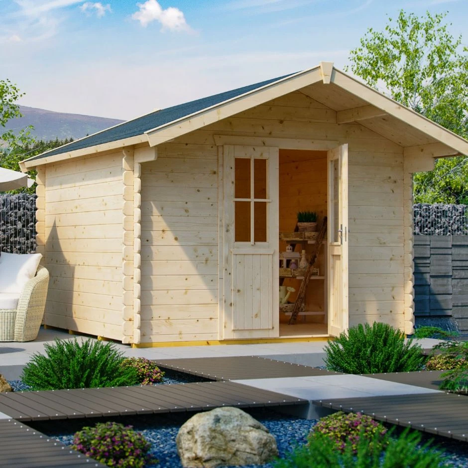 Das Skan Holz Gerätehaus Faro ist in den Varianten 300×200 cm, 300×250 cm oder 300×300 cm erhältlich. Seine Wände bestehen aus Blockbohlen mit einer Gesamtstärke von 28 mm. Das naturbelassene Nadelholz sollte direkt nach dem Aufbau mit einer farbigen oder farblosen Holzlasur behandelt werden, um das Haus vor Feuchtigkeit und Feuchteschäden zu schützen. Ein 19 mm starker Holzfußboden ist im Lieferumfang enthalten. Die mitgelieferte Dachpappe zur Ersteindeckung bietet einen vorübergehenden Schutz vor Regen und Nässe. Die Dachschindeln, die Sie zum dauerhaften Eindecken des Satteldaches benötigen, können Sie über das Zuberhörmodul mitbestestellen.