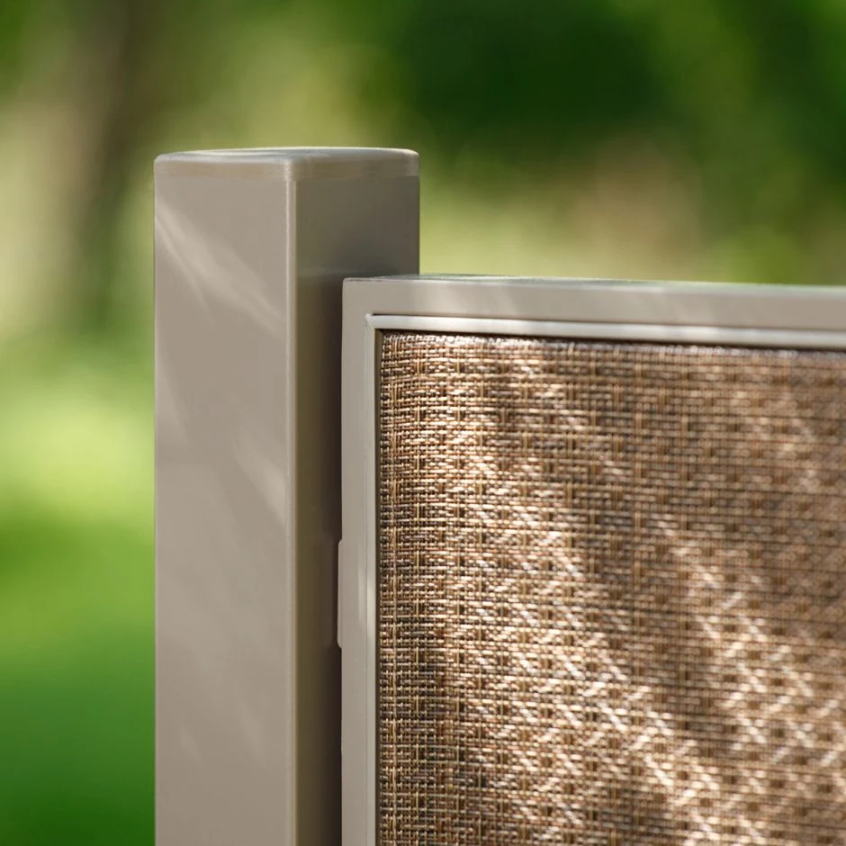 Der warme Bronze-Farbton mit der feinen Web-Struktur passt harmonisch zu allen Holzfarbtönen. Das Sichtschutzelement kann durch seinen breiten, modernen Alu-Rahmen aber auch als farblicher Kontrast für jede moderne Terrasse eingesetzt werden. WEAVE LÜX Bronze überzeugt auf jeden Fall durch sein besonderes Design und den angenehmen Farbton.