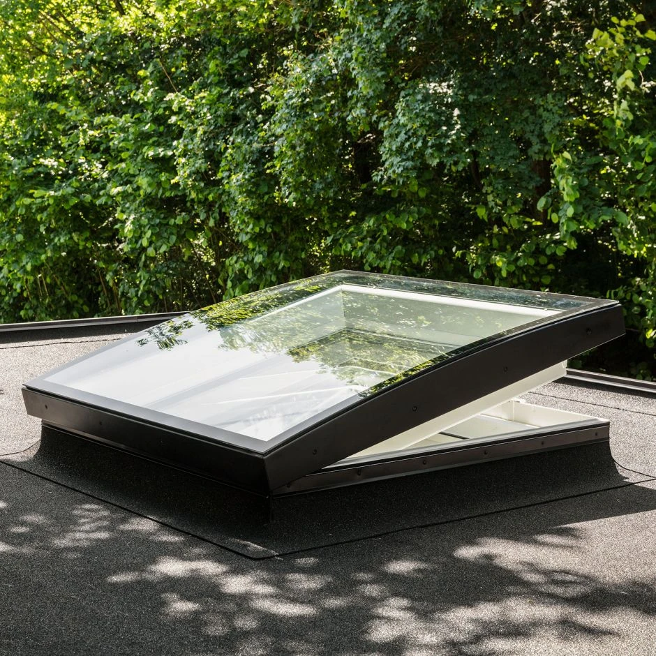Das VELUX Flachdachfenster Ober-Element Konvex-Glas mit bis zu 6 mm gehĂ€rtetem Einscheiben-Sicherheitsglas und VSG innen hat ein hochwertiges Design mit gebogener Verglasung fĂŒr flache DĂ€cher von 0° bis 15°.