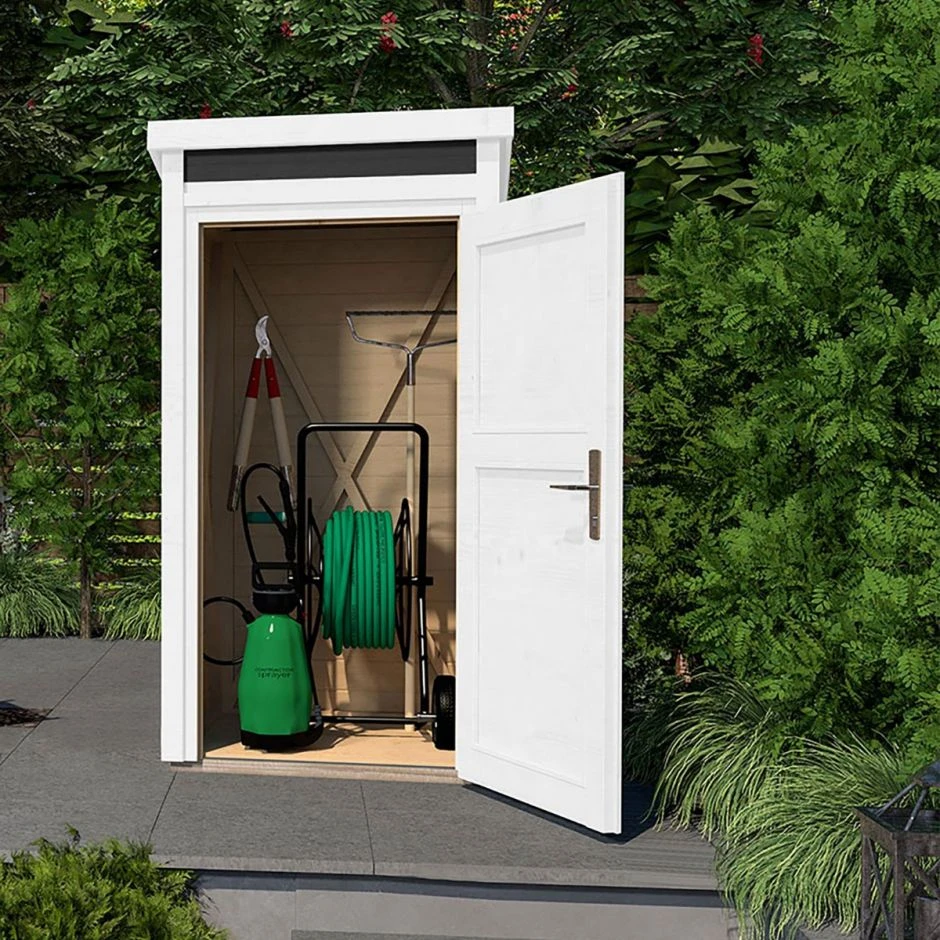 Das weka Gerätehaus 367 anthrazit eignet sich durch die kompakte Größe von 102×95 cm optimal für kleinere Gärten. Auf der Außenseite besitzt es eine Wetterschutzlasur in Anthrazit. Die Innenseite ist naturbelassen, weswegen wir empfehlen, das Holz direkt nach dem Aufbau mit einer Holzschutzlasur zu versehen. Das Haus wird in einer unkomplizierten Elementbauweise montiert. Sein stabiler Boden besteht aus ca. 19 mm starken Massivholzbohlen. Um das Dach vor Nässe zu schützen befindet sich ein selbstklebender Dachbelag im Lieferumfang.