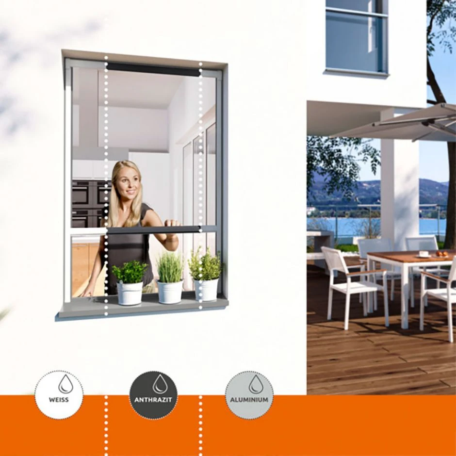 Der Rollo kann geöffnet und geschlossen werden, spezielle Anti-Windbürsten fixieren das Fliegengitter bei Wind in der Führungsschiene. Das reißfeste Gewebe hält alle Insekten vom Inneren fern und schützt sehr effektiv.