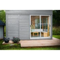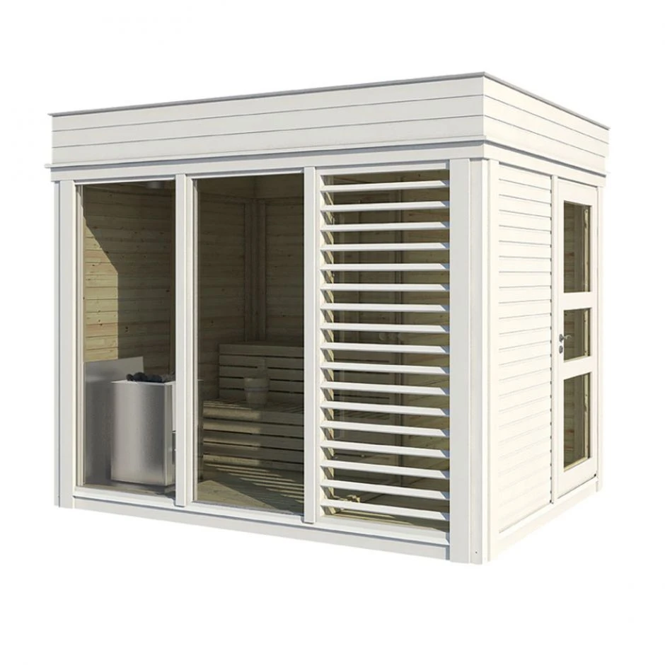 Das wolff Finnhaus Saunahaus Paradiso Fichte gibt es in vier verschiedenen GröĂen mit oder ohne Vorraum (je nach GröĂe). Das moderne Design ist ein optischer Hingucker in jedem Garten.