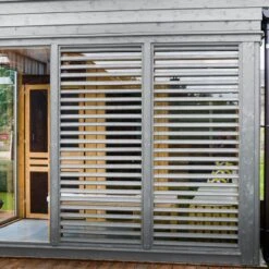 Isolierte Dachelemente, eine isolierverglaste TĂŒr und umlaufende starke Holzbalken sorgen dafĂŒr, dass die WĂ€rme im Inneren der Sauna bleibt.